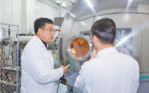王赤(左)查看仪器测试情况。 中国科学院国家空间科学中心供图
