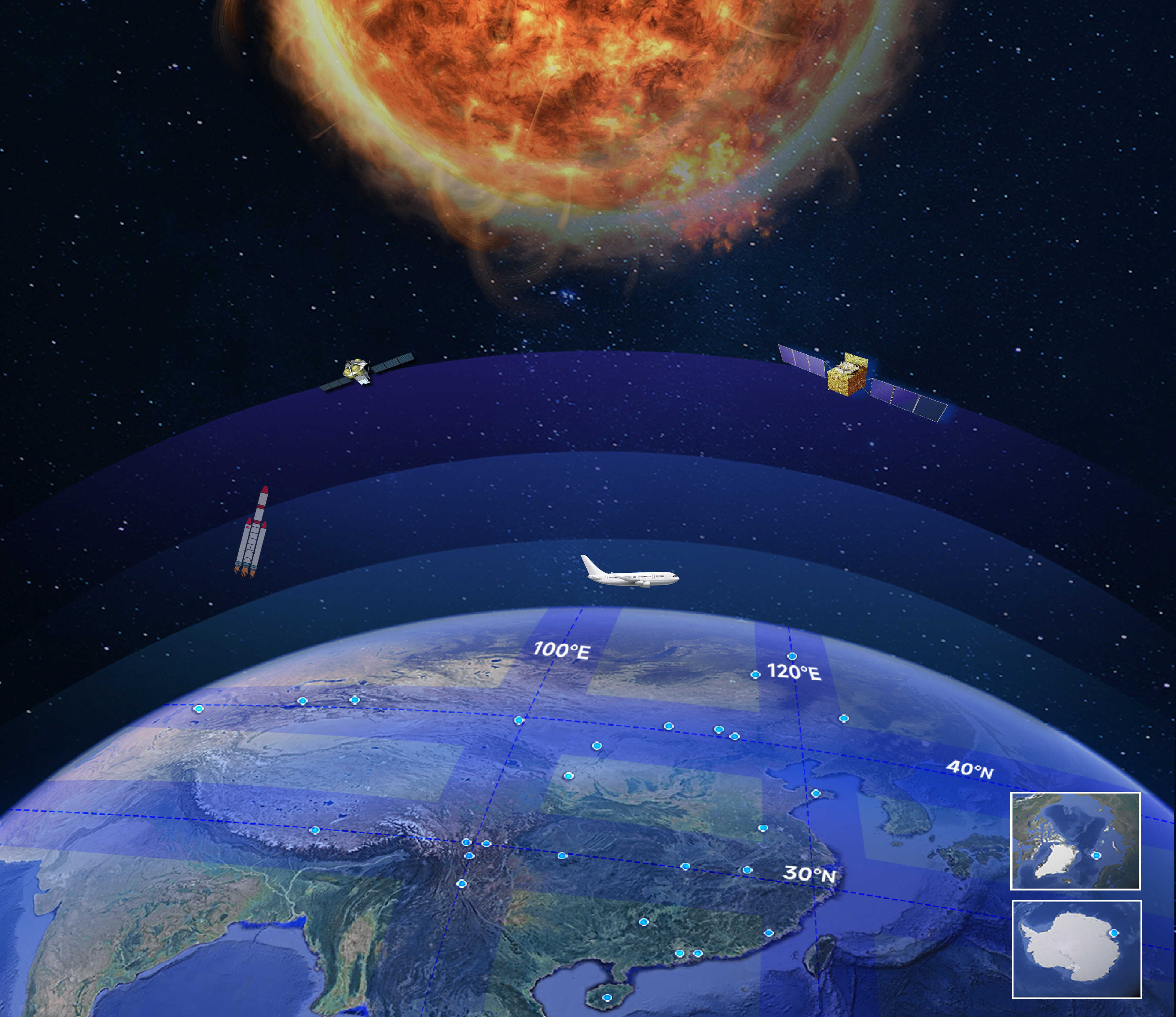 我国领跑世界空间环境地基综合监测——子午工程历经两期建设,形成了沿东经100°+120°,北纬40°+30°两纵两横式布局的31个台站、282台套监测设备的日地空间综合监测体系,其“一链、三网、四聚焦”的创新架构,具备对日地空间进行端对端的连续监测和对地球空间环境的多圈层立体探测能力,有望引领太阳活动—日地传输—对地影响的全过程研究。2012年,子午工程一期建成,实现了我国地基空间环境监测“从无到有”的跨越发展。2025年,子午工程二期通过国家验收,成为当今国际上覆盖范围最广、监测要素最全、综合能力最强的空间环境地基综合监测网,实现了“从有到强”的又一次跨越。