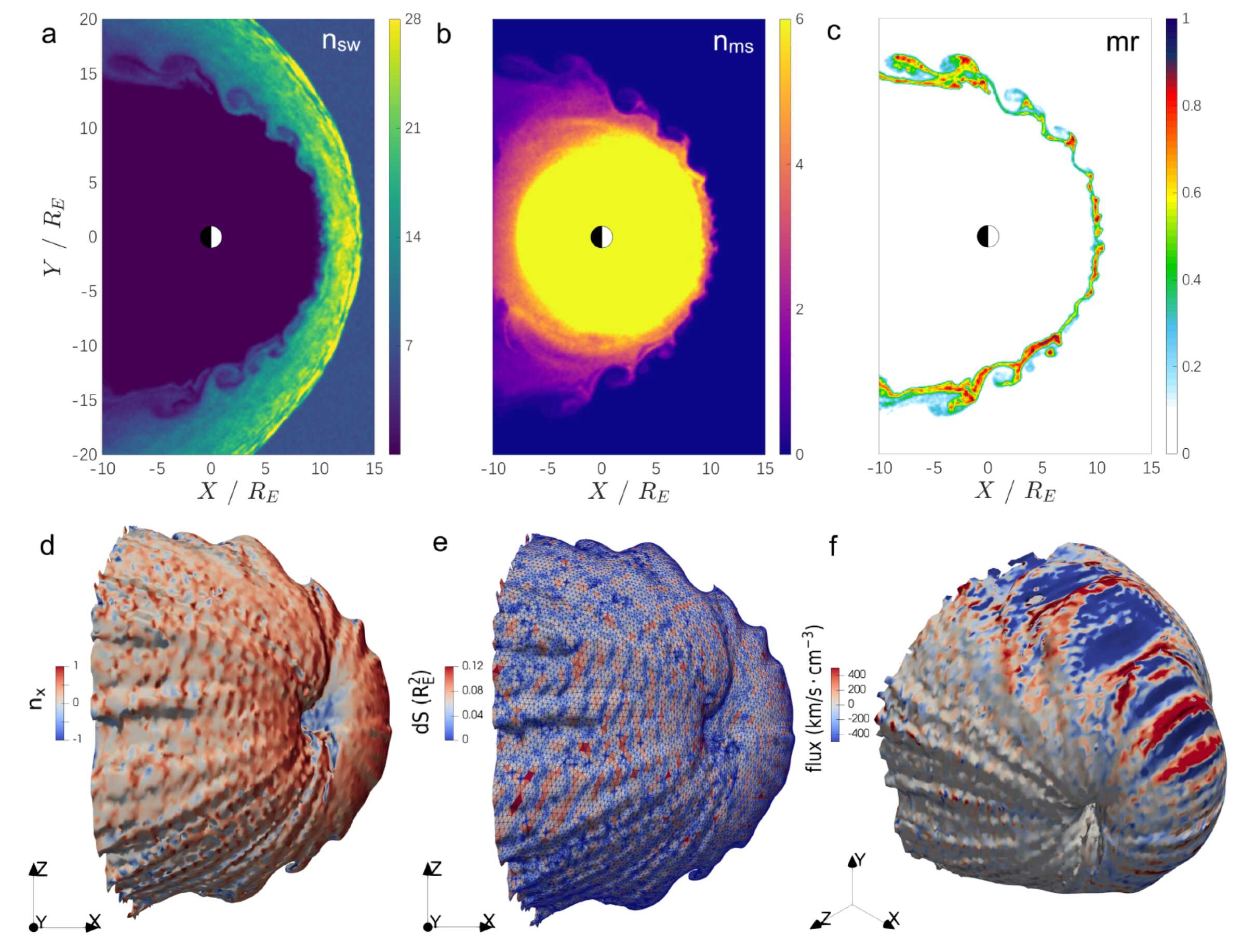 图1. 全球混合模拟中非稳态磁层顶的自动识别与进出粒子通量计算方法。(a)太阳风离子数密度nsw,(b)行星磁层离子数密度nms,(c)两种离子在边界层的混淆度mr,(d)磁层顶法向分量,(e)三角化磁层顶包络面微元面积,及(f)微元上的物质交换。