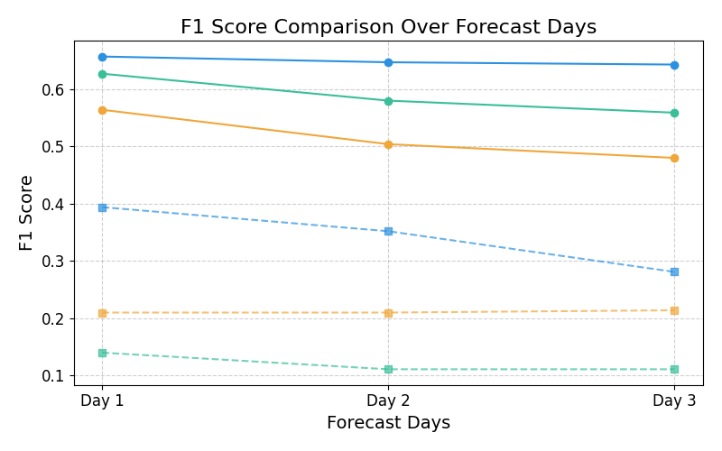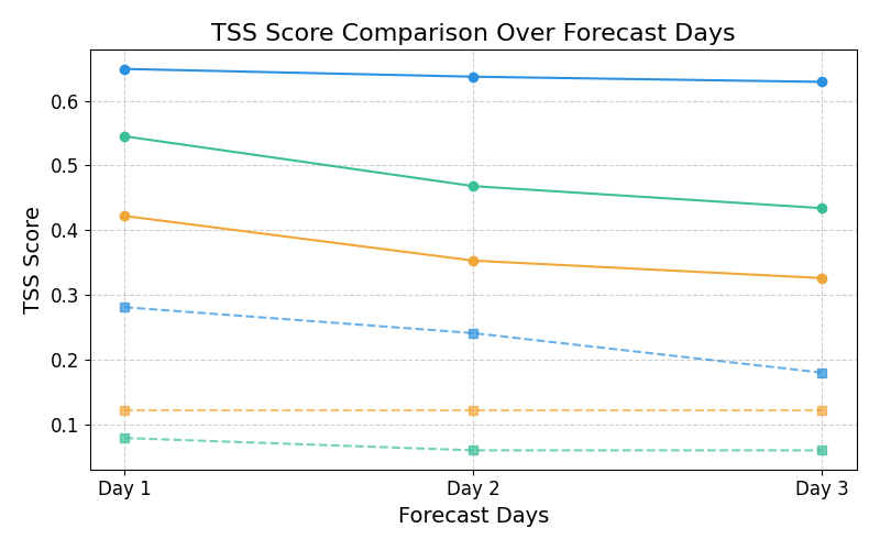 在2019-2024太阳活动从低谷上升至峰年期的预报评估中,模型的预测性能显著优于SWPC和SEPC业务模式,并在2024年5月的典型耀斑事件中成功实现72小时预警。
