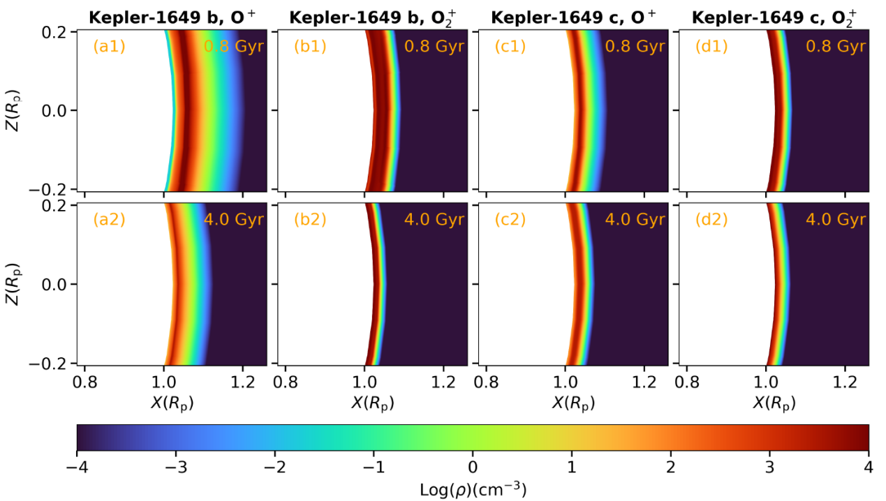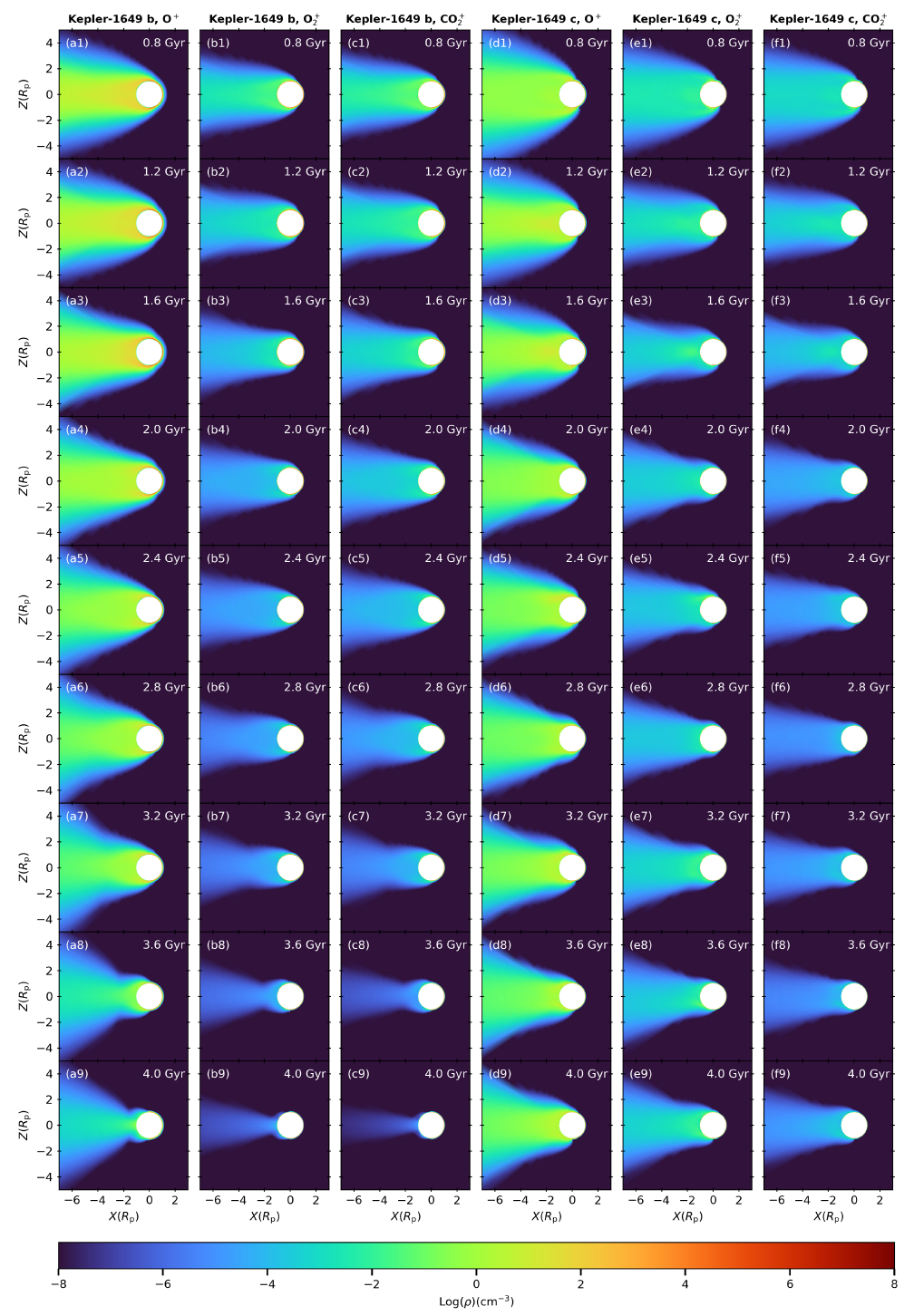 图3 Kepler-1649 b 和 c 在不同恒星年龄(0.8–4.0Gyr;从上到下)下的 X-Z 平面中对数离子数密度(cm⁻³)分布。O⁺、O₂⁺和 CO₂⁺按列显示(从左到右)。坐标归一化为行星半径 Rₚ。