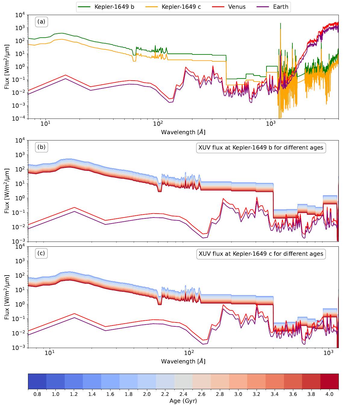 图4 Kepler-1649 b 和 c 处的恒星光谱,以及与金星和地球处的太阳光谱的比较。(a):Kepler-1649在行星b(0.0514 AU,绿线)和 c(0.0882 AU,橙线)轨道距离处的通量(W m⁻² µm-1),与金星处太阳光谱(红线)和地球处(紫线)比较。Kepler-1649 的光谱从比邻星(M5.5V)缩放而来,与其光谱类型匹配。(b) 和 (c):Kepler-1649 在行星 b 和 c 轨道距离处XUV通量(0.7nm–118nm,W m⁻² µm-1)的时序演化,跨越恒星年龄0.8–4.0Gyr。