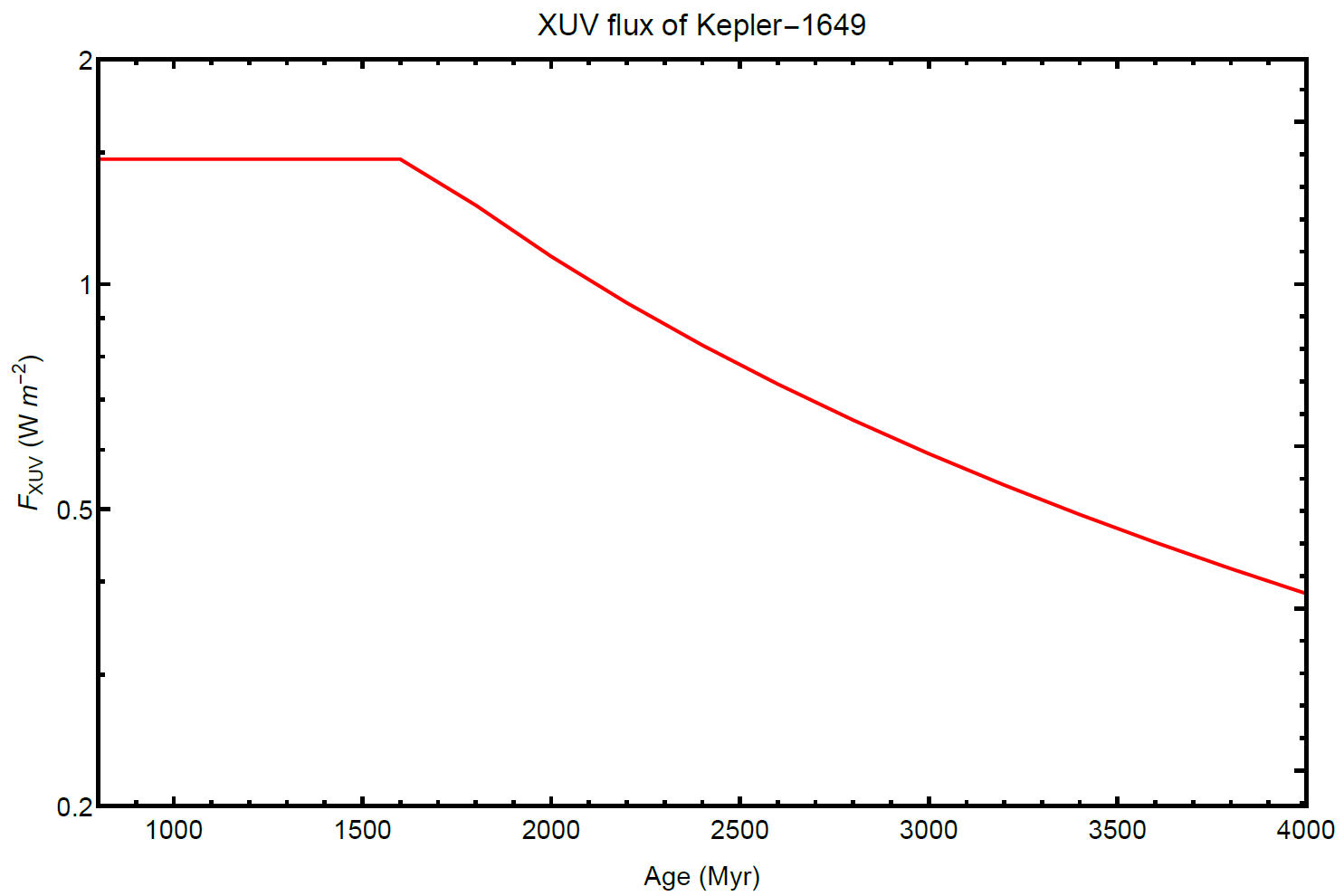 图5 Kepler-1649 的 XUV辐射通量随时间演化曲线,跨越恒星年龄 0.8–4.0Gyr。