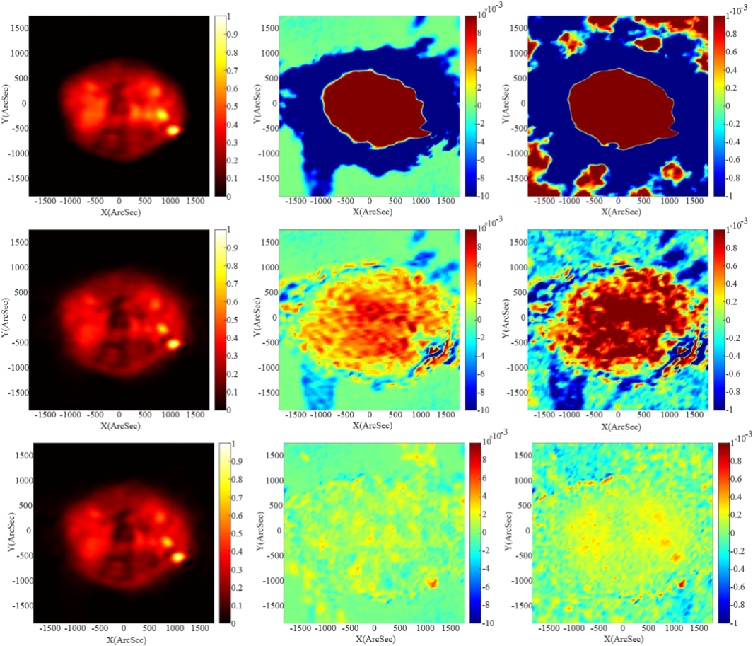 图 2 太阳中心区域重构结果。从上到下各行分别展示了MS-CLEAN、SARA和GMCP的结果;从左到右各列显示了重构图像、误差图像和残余脏图。