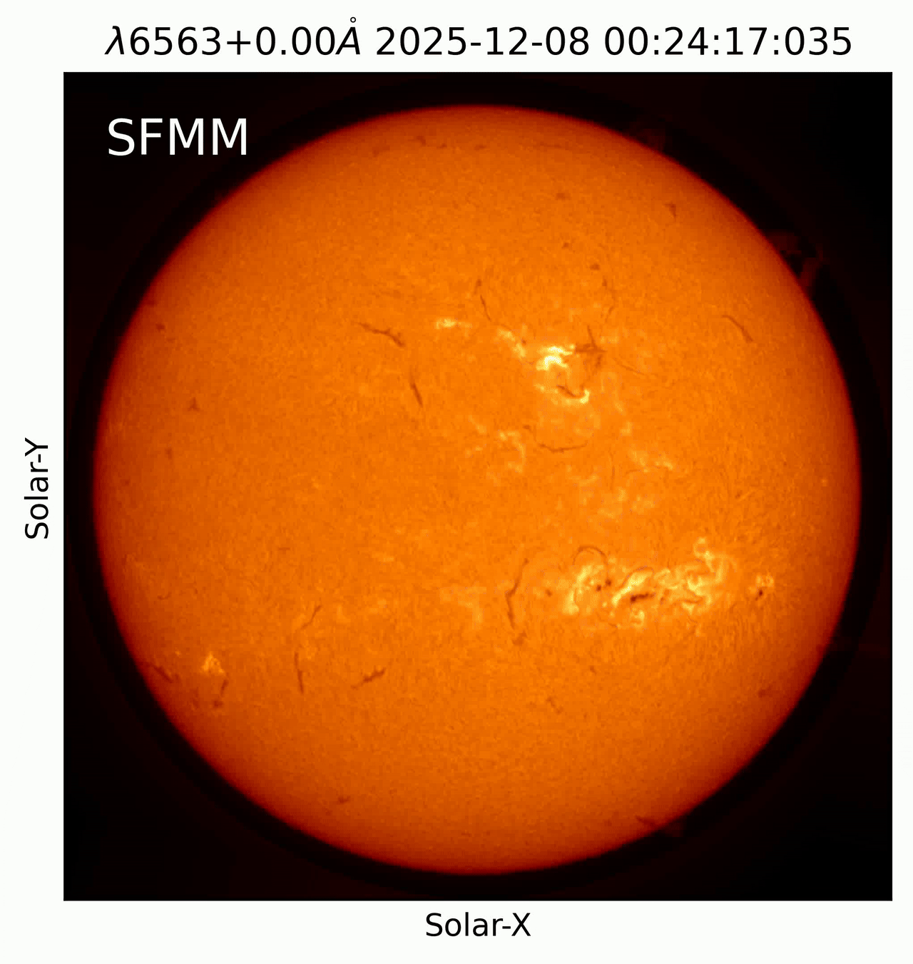 观测时间为UTC 2025-12-08 00:00-08:00期间;观测谱线为Hα 656.3nm,相对于中心波长偏移+0.00Å。[供图:中国科学院国家天文台怀柔太阳观测基地]