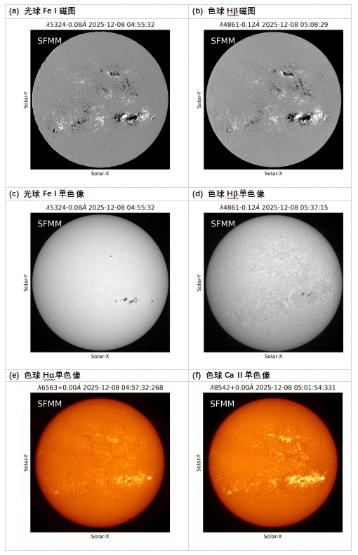 以(a)光球Fe I磁图为例,观测时间为UTC 2025-12-08 04:55:32,观测谱线为Fe I 532.4nm,相对于中心波长偏移-0.08Å。[供图:中国科学院国家天文台怀柔太阳观测基地]