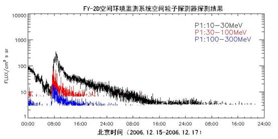 FY-2D卫星运行的轨道为地球同步轨道。空间带电粒子是卫星最主要的外部空间环境。这些带电粒子容易在卫星中产生各种辐射效应,对卫星的安全运行构成威胁,尤其是偶发的太阳耀斑粒子(太阳质子事件)因能量高、通量大,对卫星的影响最大。 FY-2D空间环境监测器由太阳X射线探测器和空间粒子探测器组成,用于监测太阳活动和轨道空间的带电粒子辐射,警报和通报太阳质子事件和地磁扰动,为卫星的在轨安全保障服务。监测器能实现实时、连续对太阳和带电粒子监测,是我国开展“空间天气”监测警报的基础。 FY-2D卫星于2006年12月8日成功发射,星载空间环境监测器在14日加电工作,空间中心自建的地面接收系统实时接收监测器的探测数据。2个多月的在轨运行期间,FY-2D卫星空间环境监测器一直工作正常、稳定,并获得一批珍贵的探测结果。目前,FY-2D卫星空间环境监测器已圆满完成在轨测试,展开正式的业务运行。以下给出在轨测试期间,FY-2D卫星空间环境监测器部分探测成果。 1)空间环境宁静期,地球同步轨道高能电子昼夜变化特征 地球同步轨道位于外辐射带的外边缘,该轨道的高能带电粒子均为辐射带的 捕获粒子。根据空间粒子探测器的探测结果,该轨道高能带电粒子(高能电子)通量分布呈现24小时昼夜变化特征。基本在卫星地方时(较北京时间晚约2小时)午时通量最大,子时通量最小。  图1 高能电子通量日周期变化 2)磁暴时高能电子的响应及扰动特征 自监测器加电以来,截止到2007年3月,仅发生1起大的地磁暴(2006年12月15日),地磁暴期间,高能电子通量出现剧烈起伏,见图2。从高能粒子探测器的探测结果看,地球同步轨道高能电子扰动的一般过程:在扰动发生时,高能电子通量陡然下降,持续一段时间后,通量又脉冲式增加,恢复扰动前的通量水平。