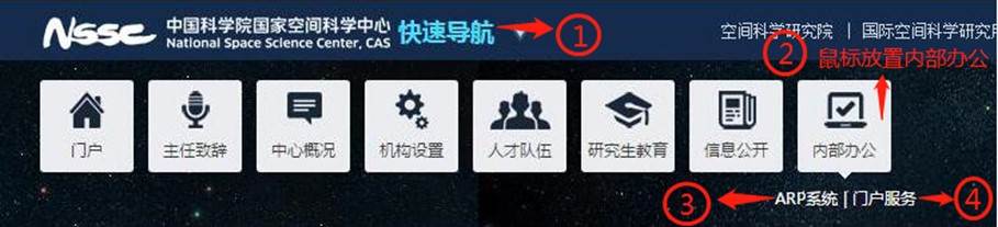 1) 方式一:打开中心网站(http://www.nssc.ac.cn)->点击“快速导航”->鼠标放置“内部办公”->点击“ARP系统”->首次访问需要在页面下载安装新版VPN客户端,输入科技云账号与密码登录,详细登录见附件1。如图所示: