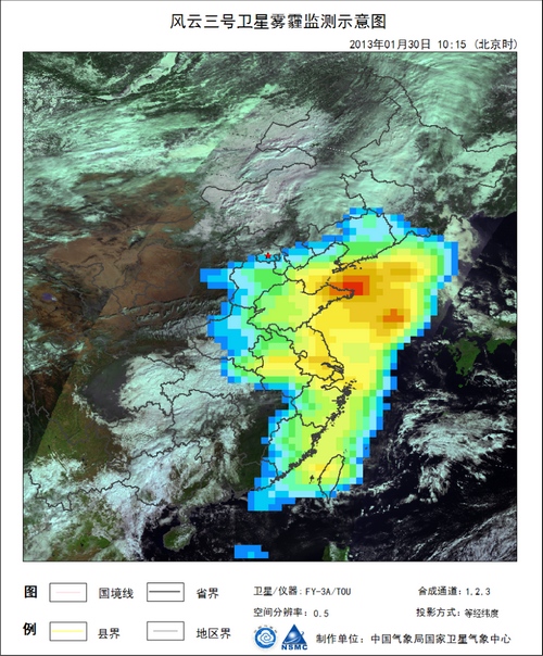 1月7至16日和1月28至31日,我国中东部大部分地区持续出现雾霾天气。由国家空间科学中心自主研制的紫外臭氧总量探测仪利用吸收性气溶胶指数AAI(The Absorbing Aerosol Index)成功对雾霾进行监测。中国气象局正是利用该风云三号气象卫星紫外臭氧总量探测仪实现了对雾霾事件的全过程监测。图1和图2为1月29至30日的雾霾监测情况。
