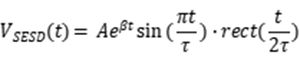 研究表明,时序电路中的复位和电源端口对SESD敏感,且复位信号的误识别和PMOS的可恢复击穿是产生“软错误”的主要机理。提出了阻尼衰减正弦振荡脉冲SESD干扰源模型,具体特征与参数如下公式和图例所示。其中,SESD脉冲主峰的幅值(A)与脉宽(τ)是诱发DFF产生软错误的主要特征参数,导致该DFF存储数据出错的正/负向SESD脉冲幅度与脉宽阈值分别约为1.2V、0.6ns 和-0.64V、20ps。