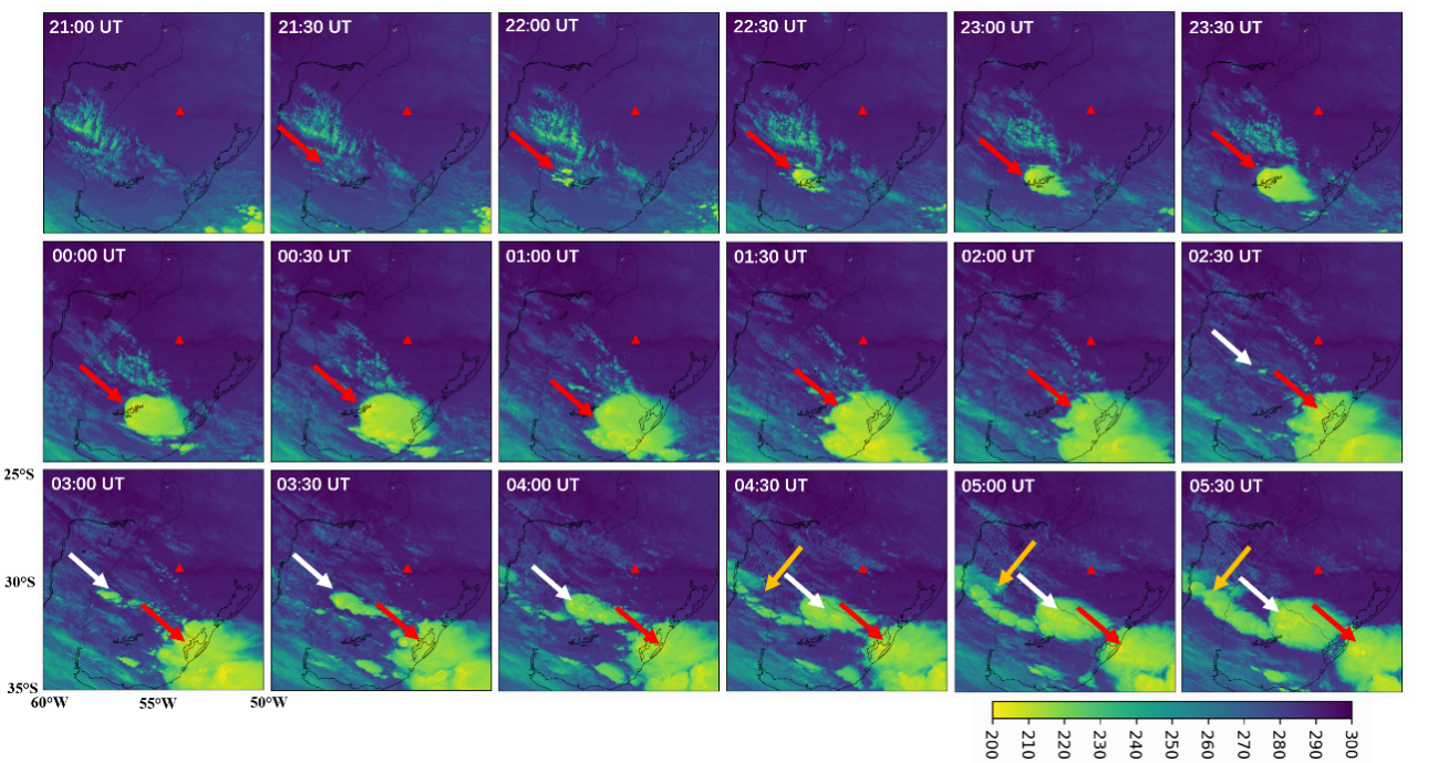 近期,中国科学院国家空间科学中心太阳活动与空间天气全国重点实验室中高层大气和电离层研究室与巴西国家空间研究院(INPE)合作,利用中国科学院南美空间天气实验室在巴西圣玛丽亚观测台站的双通道气辉观测系统(630.0 nm与OH波段),结合卫星探测,于2023年9月17-18日在巴西南部区域同时观测到中间层顶和热层大气强烈的环形重力波事件(CGWs),该波动现象持续达10小时以上,振幅扰动高达24%(而过去观测的CGWs的平均振幅仅为2%-3%),波心移动超过400公里。通过GOES-16卫星观测发现,CGWs是由快速移动的低层大气超强对流系统激发产生(见图一)。此CGWs的持续时间、波动振幅以及波源移动速度都非常罕见(见图二)。