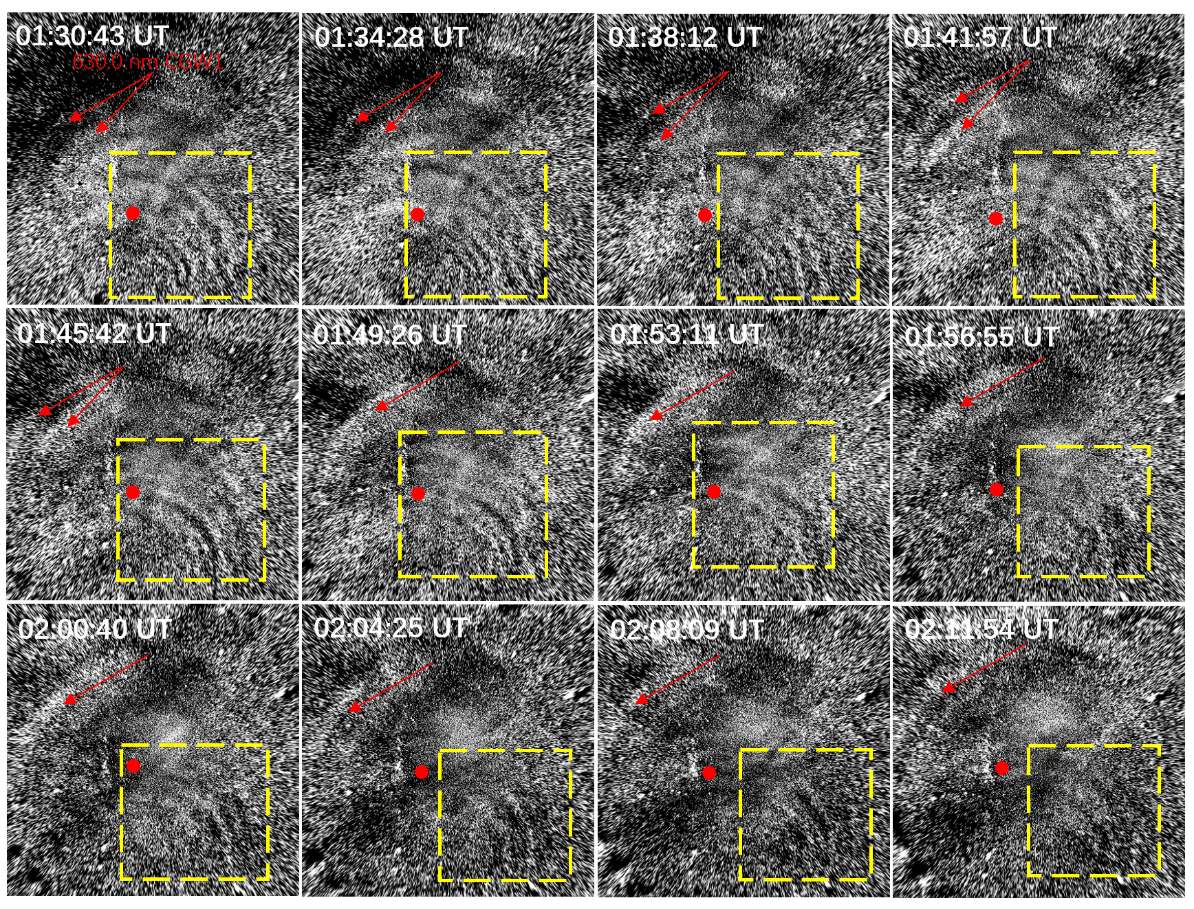 图三.巴西圣马利亚台站观测的热层环形重力波,黄色虚线方框是泄漏的OH气辉辐射信号。