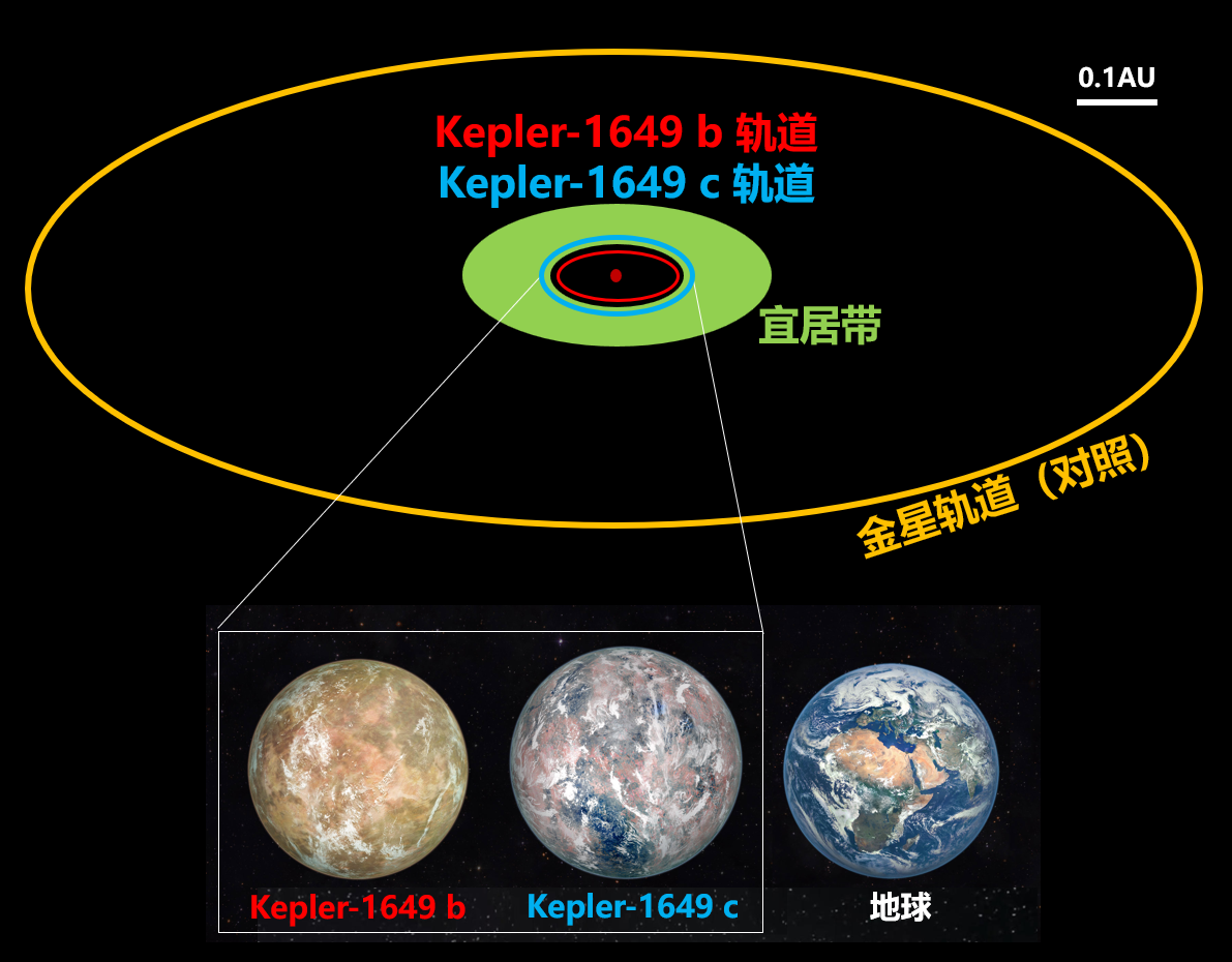 图1 Kepler-1649系统示意图。图中红色圆点为宿主恒星Kepler-1649,红色椭圆为Kepler-1649 b的轨道,蓝色椭圆为Kepler-1649 c的轨道,绿色环带为宿主恒星Kepler-1649的宜居带,橙色椭圆为金星轨道大小(对比参照),下方为Kepler-1649 b和c与地球的大小对比。(图中行星图像来自Wikipedia)
