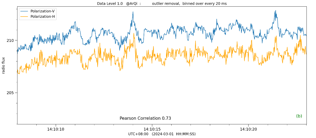 Xiong et al.(2026)报道IPS望远镜初光,捕捉到来自3C446类星体的双极化IPS信号,实现行星际太阳风速度的地基遥测,验证子午IPS原始数据定标的软件功能。该初光的天区穿刺视点位于24个太阳半径,其双极化通道的IPS时序信号表现为强相关性。