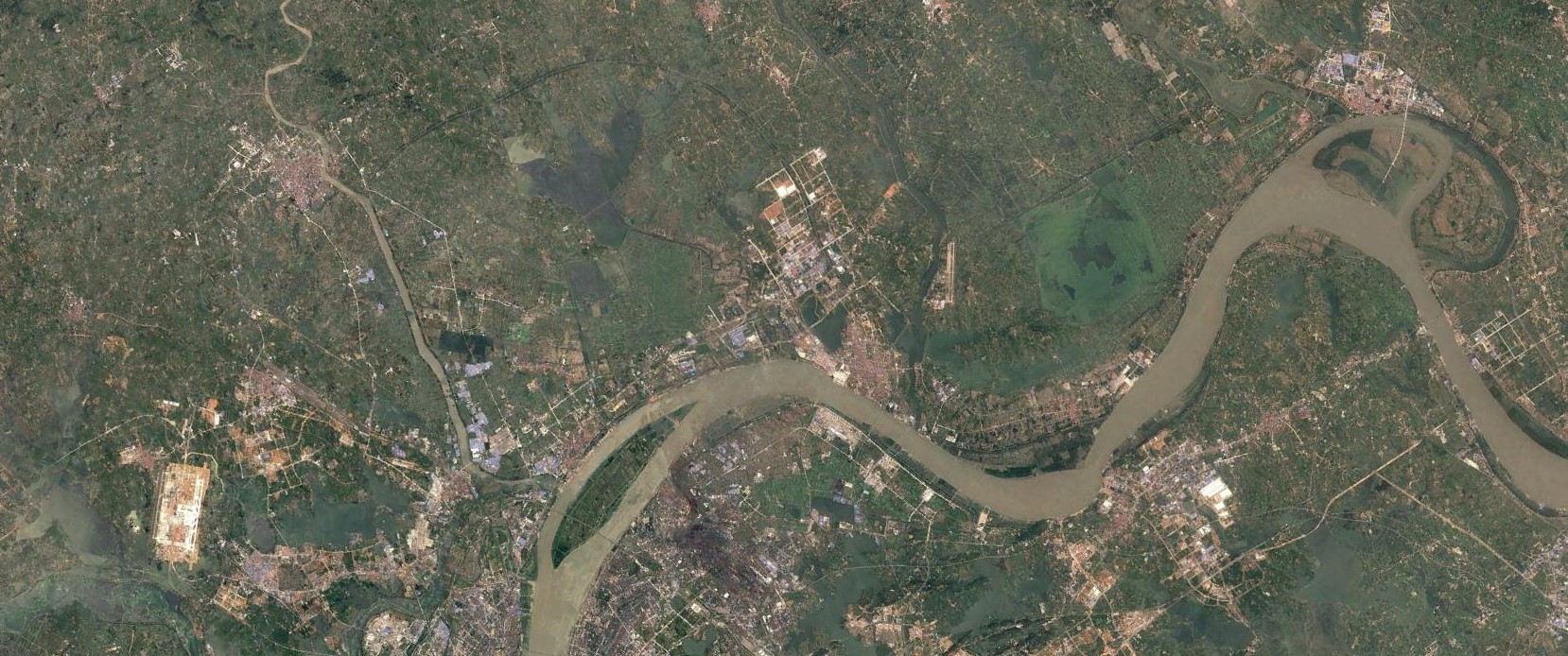图七:上图是武汉地区长江以及多个湖泊的成像结果。下图是将天宫二号高度计的幅度图像和三维高程图像与谷歌光学图像(上图)融合后的伪彩色图像。对比光学图像,融合后的图像中水体的颜色更加鲜明,地表信息更加丰富。
