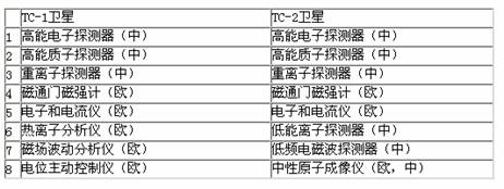 在首席科学家和空间物理探测器(有效载荷)任务科学家(Principle Investigator, PI)需求的指导下,负责为两颗卫星各研制8台探测器。其中TC-1(赤道星)星有三台国产的探测器,5台欧空局提供的探测器;TC-2(极轨星)星有五台国产的探测器,2台欧空局提供的探测器,1台中欧合作研制的探测器,并负责探测器的标定、交付、试验、发射服务、在轨测试及运行阶段的工程服务。两颗卫星的探测器配置如下表,除了TC-1星的主动电位控制仪和TC-2星的中性原子成像仪是根据轨道不同而单独设置的以外,其他各台仪器从探测性能上来讲都是相同的,可以在不同的空间区域中获取同类型的物理参数。 |