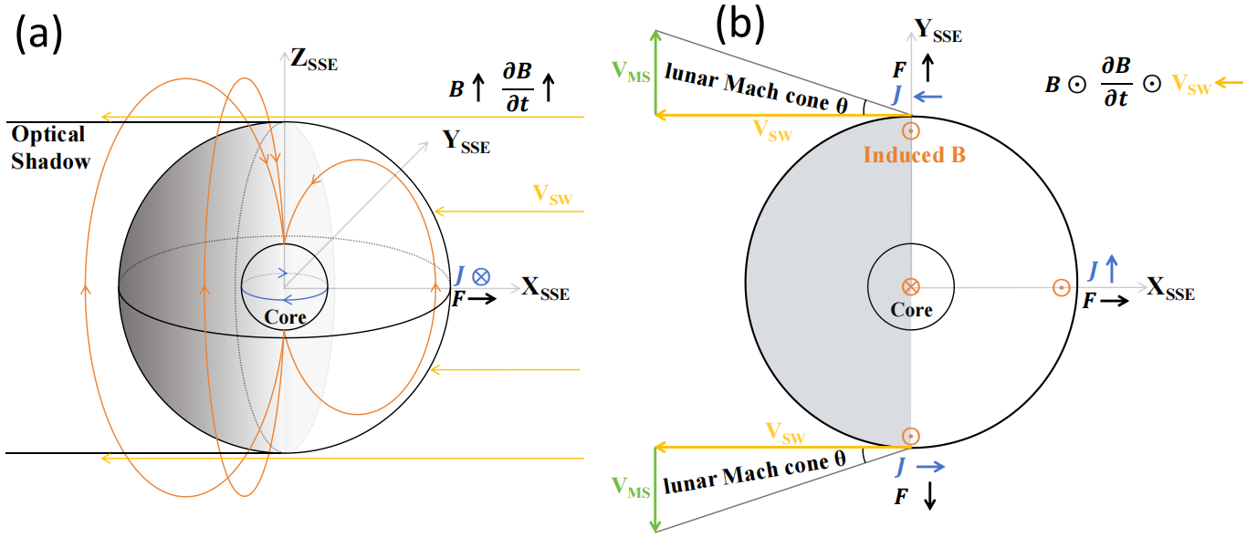 图2:月核感应磁场引起月球临边压缩的物理机制示意图。(a)在月心太阳黄道(SSE)坐标系下的三维示意图。(b)z=0平面下的示意图。图中标出了磁场(B)、电流(J)以及磁力(F=J×B)。