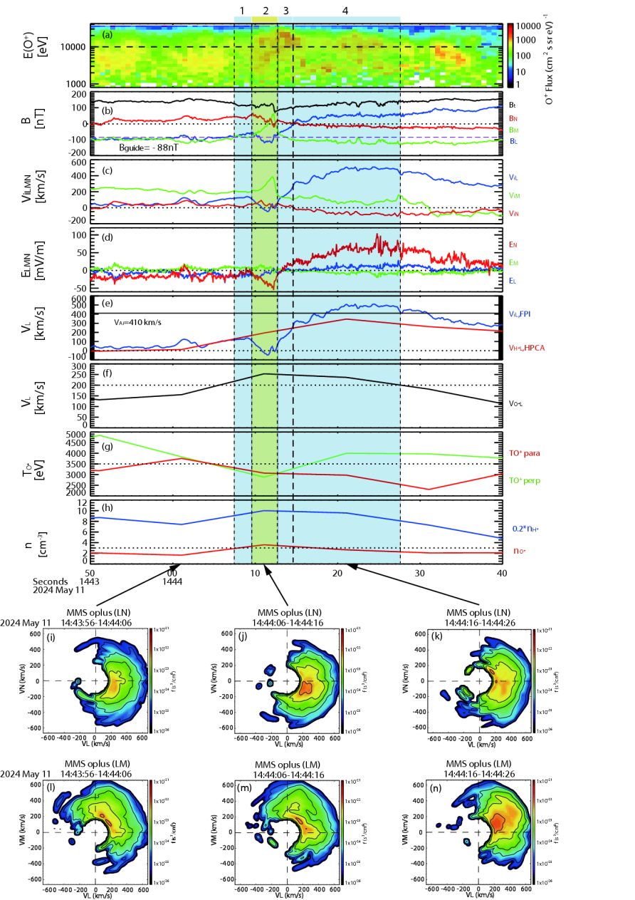 图1. 2024年5月超强磁暴期间MMS3卫星观测到富含能量O⁺离子的磁层顶磁重联离子扩散区。