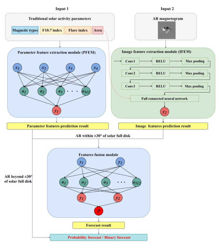 针对上述问题,中国科学院国家空间科学中心太阳活动与空间天气全国重点实验室预报中心团队在耀斑预报研究方面取得新进展,提出了一种面向全日面活动区的耀斑集合预报模型。该模型融合两类互补信息:一类是来自太阳光球磁场观测的活动区磁图;另一类是适用于全日面活动区的传统太阳活动参数,如活动区磁类型、10厘米射电流量、耀斑指数等。模型由三个核心模块组成:参数特征提取模块利用全连接神经网络提取太阳活动参数中的统计特征;图像特征提取模块利用卷积神经网络从日面中心的活动区磁图中提取空间结构信息;融合模块则将两种信息进行综合分析,最终给出未来48小时内是否可能发生中等强度(M级)及以上级别耀斑的概率预测。