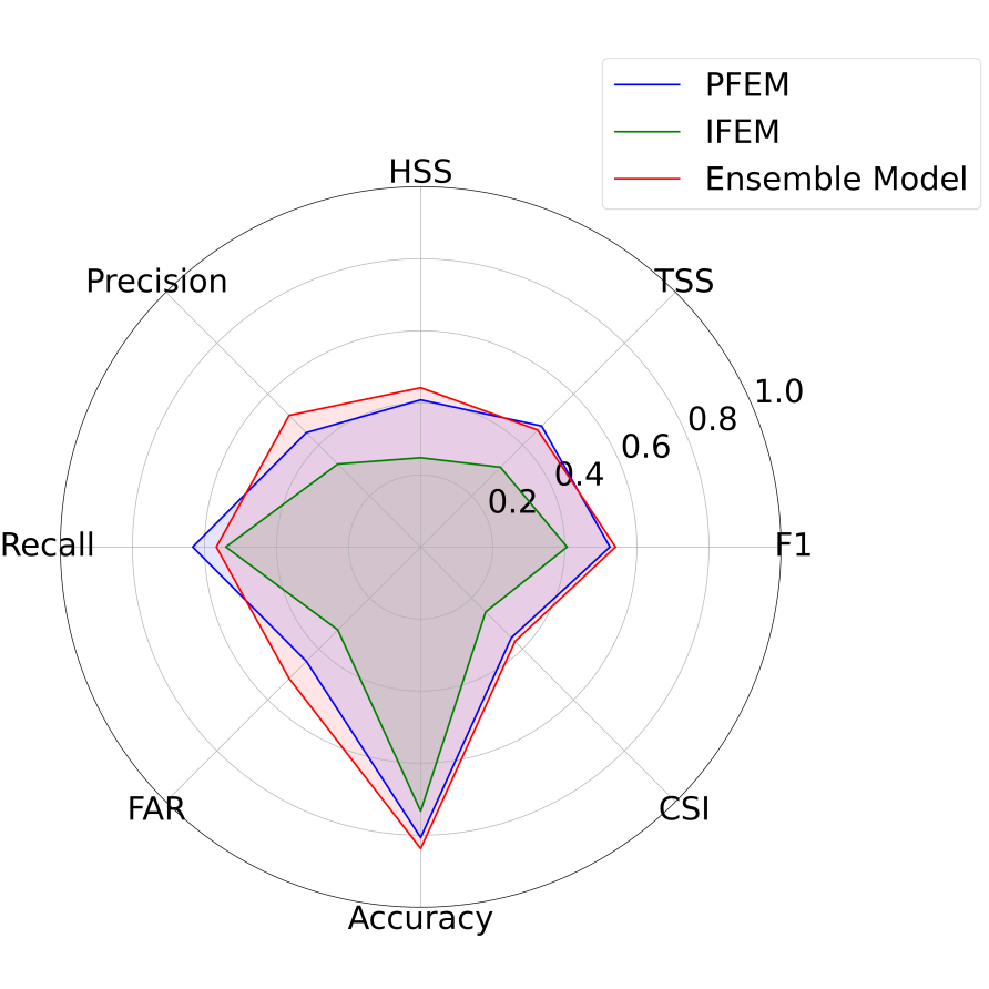 图 2:单独使用参数(PFEM)、单独使用磁图(IFEM)和集合预报模型在同一数据源中的预测性能比较