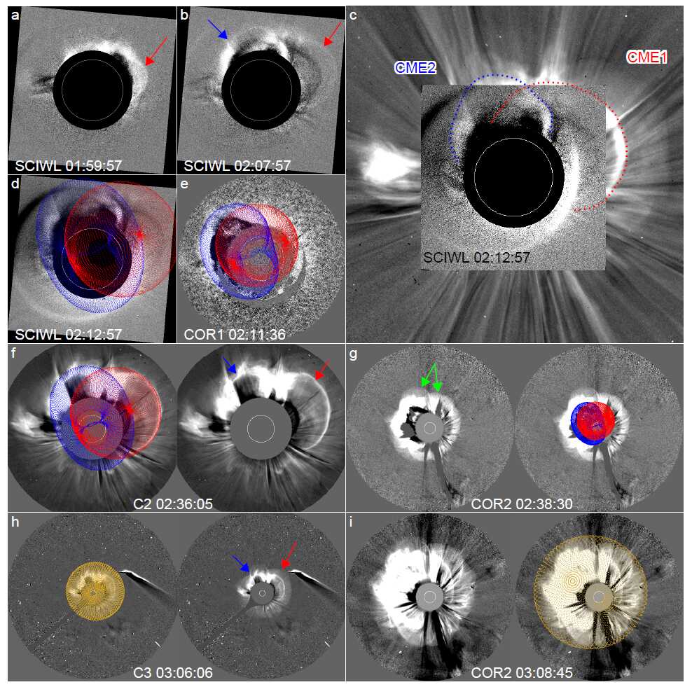 图1. 多日冕仪联合观测与GCS模型拟合。(a)、(b)夸父一号SCIWL观测到的双CME先后浮现过程;(c)SCIWL与LASCO观测叠加对比图(红色:跨活动区-宁静区暗条;蓝色:活动区CME);(h)、(i)基于球形激波模型的拟合结果。