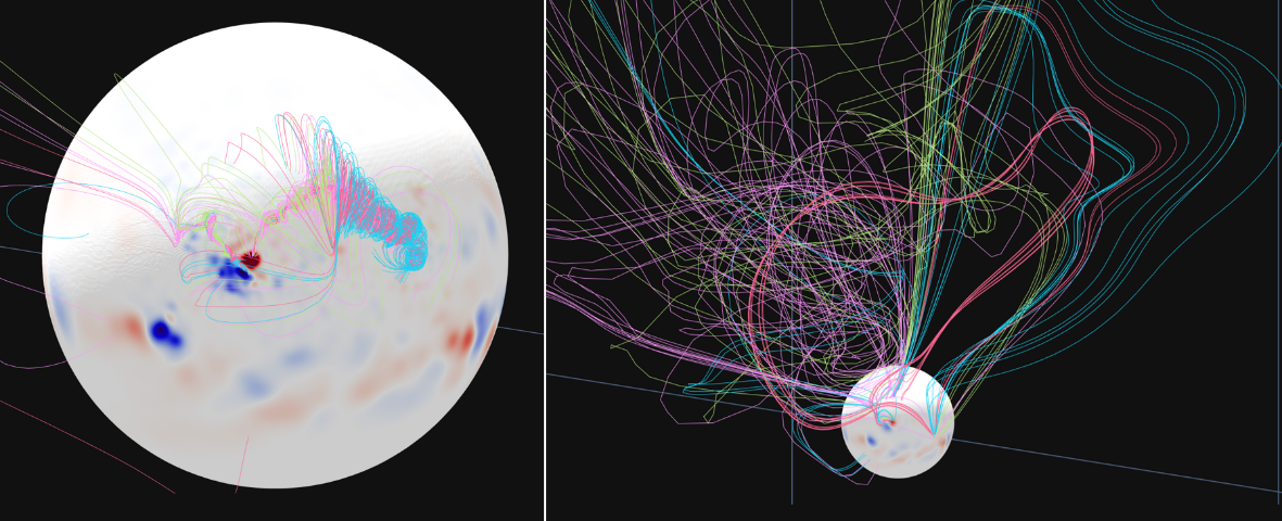 图3. CORHEL-CME模拟结果。左:爆发初期跨活动区暗条与活动区磁绳的磁场拓扑位型。右:双CME爆发后形成的复杂磁场位形及连通性特征。